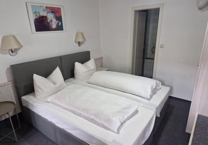 - Schlafzimmer sind ausgestattet mit großem Boxspringbett, Nachttisch mit Nachttischlampe, Fernseher und Kleiderschrank
