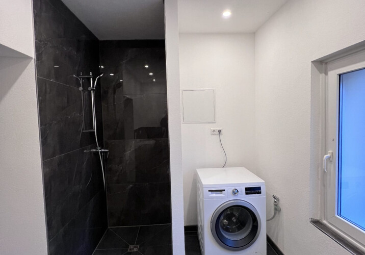 - Schönes Bad mit Dusche, Waschbecken, Toilette, Spiegelschrank und Waschmaschine