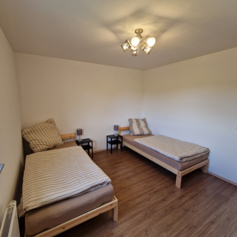 Schlafzimmer mit 2 Einzelheiten, Badezimmer mit Dusche, Waschmaschine & Trockner, großer Wohn-/Ess-Bereich mit Küche.