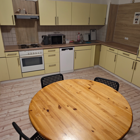 Die Küche ist mit Kühlschränken, einer Spülmaschine, Mikrowelle, Kaffeemaschine, Wasserkocher, Herd etc. und allem was nötig für die Selbstversorgung ist ausgestattet. In der Küche selbst gibt es auch eine großen Tisch mit Stühlen .