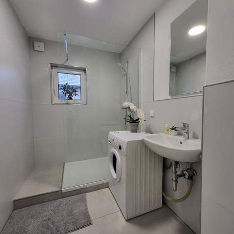 + Die Badezimmer verfügen über ein Waschbecken, eine große ebenerdige Dusche und eine Waschmaschine