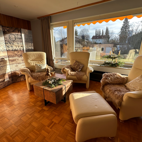 mit 2 Einzelbetten, 90x200cm hinter großem Paravent und gemütlicher Loungeecke mit Sat-TV und Panoramafenster, Zugang zur Terrasse