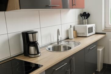 Unsere großen Gemeinschaftsküchen sind vollständig ausgestattet mit Kochutensilien, Geschirr und Besteck. Kühlschrank, Mikrowelle und Herd. Kaffeemaschine und Wasserkocher.