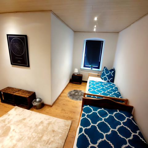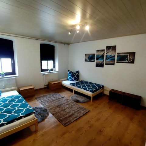 Die beiden geräumigen Schlafzimmer bieten jeweils Platz für zwei bzw. drei Personen. Sie sind gemütlich eingerichtet und verfügen über stabile Massivholzbetten, was den Monteuren einen angenehmen Aufenthalt gewährleistet.