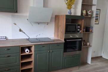 Voll ausgestattete Küche mit Herd, Backofen, Kühlschrank, Mikrowelle, Geschirrspüler.