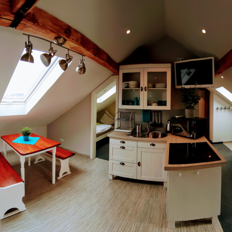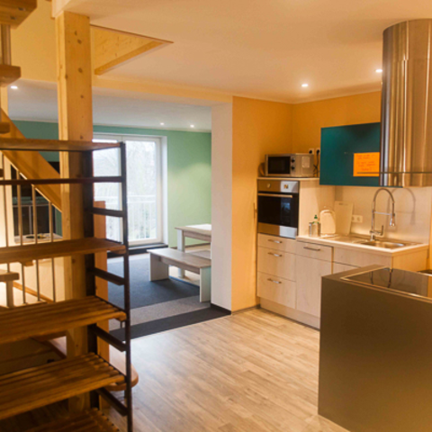 Unsere neue und komfortable Maisonette-Wohnungen bietet Platz für bis zu 10 Personen - die Schlafräume befinden sich ruhig gelegen im oberen Bereich.
