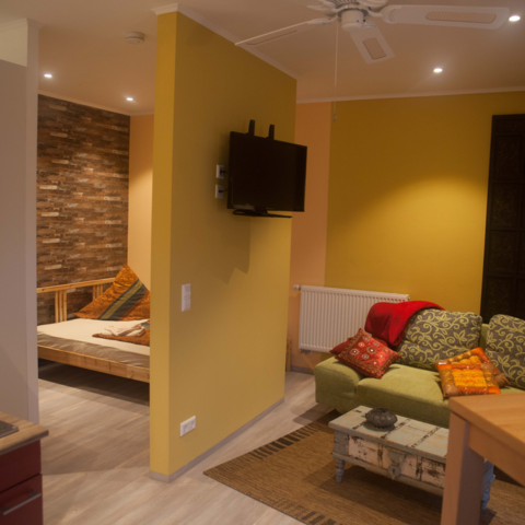 Weiterhin können wir unsere großzügig gestaltete Gästewohnung ist mit einer freundlichen Wohnküche, zwei hellen und gemütlichen Zweibettzimmern und einem Bad/WC auf ca. 70qm ausgestattet für bis zu 6 Personen oder unsere WG-Wohnung mit vier 2-Bett-Zimmern für bis zu 8 Personen bietet.