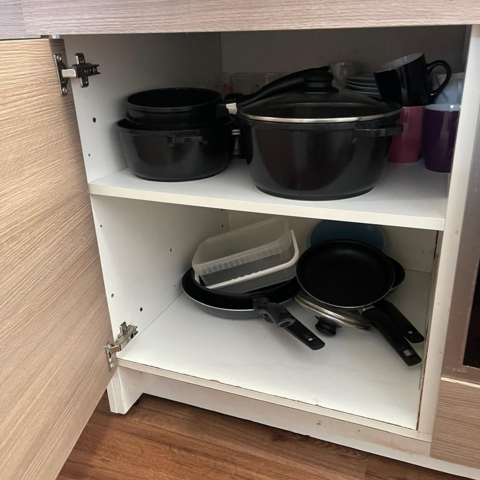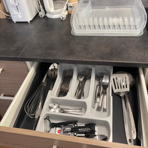 Die moderne Küche ist vollständig ausgestattet mit einem Induktionsherd, Backofen und Kühlschrank. Teller, Töpfe, Löffel – alles, was Sie zum Kochen und Essen benötigen, steht einsatzbereit zur Verfügung. Alle Küchengeräte sind neu und sofort einsatzbereit.