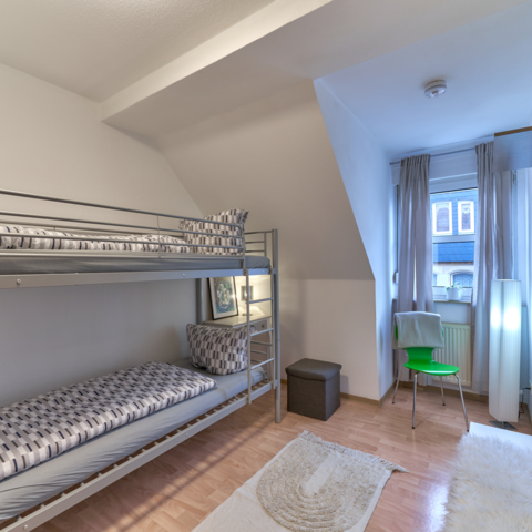 Im Obergeschoss finden Sie drei bequeme Einzelbetten und ein Etagenbett – ideal für Gruppen. Jedes Zimmer ist hell, modern eingerichtet und mit hochwertiger Bettwäsche ausgestattet. Das garantiert einen erholsamen Schlaf nach einem langen Arbeitstag.