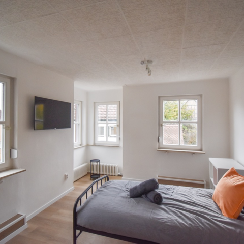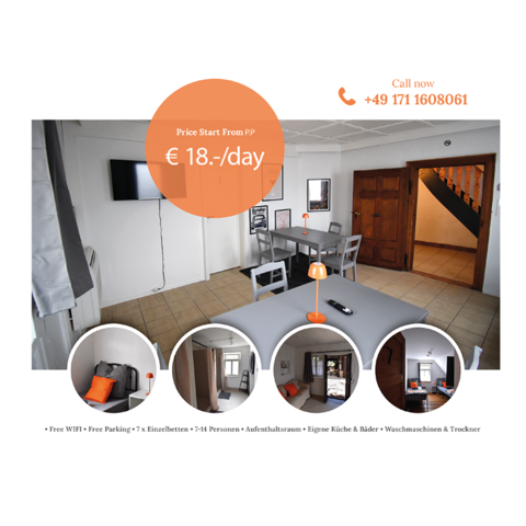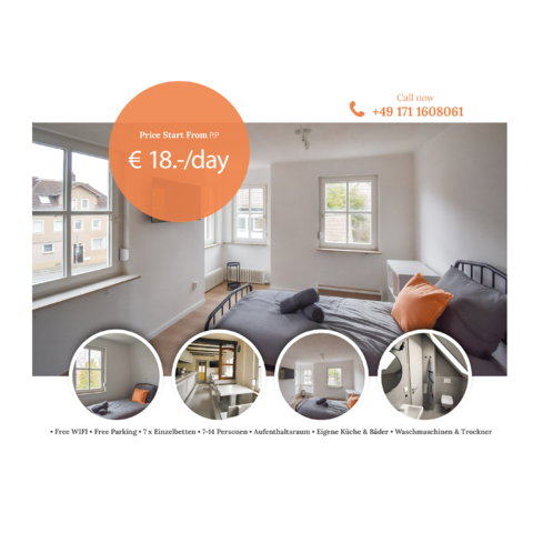 Vermietet wird ein schönes vollmöbliertes kernsaniertes Haus mit 6x Schlafzimmern und einem einzigartigem Aufenthaltsraum im Herzen von Heilbronn/Neckarsulm. Das Haus besteht aus insgesamt 6 abgetrennten Schlafzimmern, die entweder über ein/oder zwei Einzelbetten verfügen. Dementsprechend bietet das Objekt Platz für bis zu 12 Personen. Ein großer Aufenthaltsraum mit TV, großzügiger vollausgestatteter Küche, sowie 5 Duschen und 6 WCs. Ein schöner Garten zum Entspannen und Grillen befindet sich hinter dem Haus. Der private Parkplatz bietet Platz für bis zu drei Fahrzeuge.
