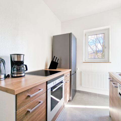Küche: Kühl-Gefrierkombinationen, Spülmaschine, Backofen, Mikrowelle, Kaffeemaschine, Toaster, Wasserkocher, Töpfe, Pfannen, Geschirr, Gläser, Tassen, Besteck, diverse Kochutensilien, Gewürze, Kaffee, Kaffeefilter, Öl, Zucker und Süßstoff