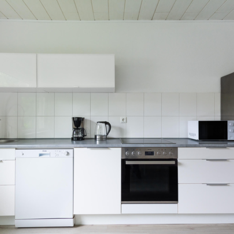 Küche: Kühl-Gefrierkombinationen, Spülmaschine, Backofen, Mikrowelle, Kaffeemaschine, Toaster, Wasserkocher, Töpfe, Pfannen, Geschirr, Gläser, Tassen, Besteck, diverse Kochutensilien, Gewürze, Kaffee, Kaffeefilter, Öl, Zucker und Süßstoff