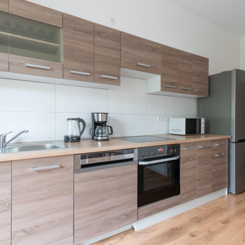 Küche: Kühl-Gefrierkombinationen, Spülmaschine, Backofen, Mikrowelle, Kaffeemaschine, Toaster, Wasserkocher, Töpfe, Pfannen, Geschirr, Gläser, Tassen, Besteck, diverse Kochutensilien, Gewürze, Kaffee, Kaffeefilter, Öl, Zucker und Süßstoff