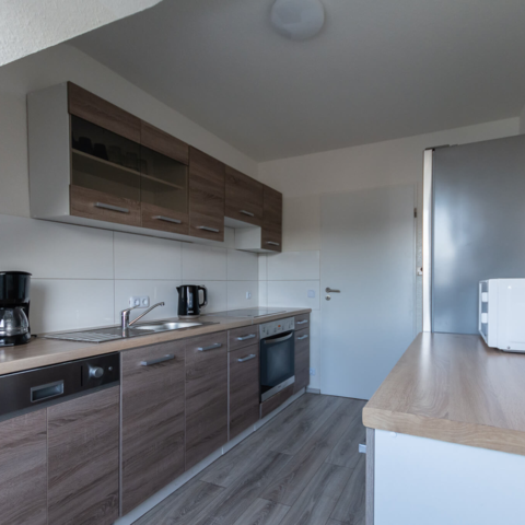 Küche: Kühl-Gefrierkombinationen, Spülmaschine, Backofen, Mikrowelle, Kaffeemaschine, Toaster, Wasserkocher, Töpfe, Pfannen, Geschirr, Gläser, Tassen, Besteck, diverse Kochutensilien, Gewürze, Kaffee, Kaffeefilter, Öl, Zucker und Süßstoff