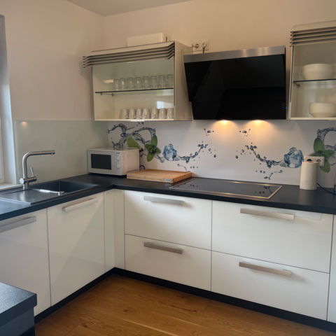 Küche: Kühl-Gefrierkombinationen, Spülmaschine, Backofen, Mikrowelle, Kaffeemaschine, Toaster, Wasserkocher, Töpfe, Pfannen, Geschirr, Gläser, Tassen, Besteck, diverse Kochutensilien, Gewürze, Kaffee, Kaffeefilter, Öl, Zucker und Süßstoff