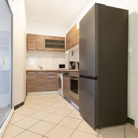 Küche: Kühl-Gefrierkombinationen, Spülmaschine, Backofen, Mikrowelle, Kaffeemaschine, Toaster, Wasserkocher, Töpfe, Pfannen, Geschirr, Gläser, Tassen, Besteck, diverse Kochutensilien, Gewürze, Kaffee, Kaffeefilter, Öl, Zucker und Süßstoff