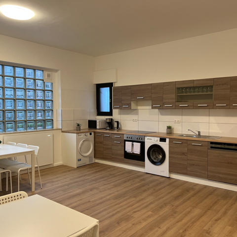 Küche: Kühl-Gefrierkombinationen, Spülmaschine, Backofen, Mikrowelle, Kaffeemaschine, Toaster, Wasserkocher, Töpfe, Pfannen, Geschirr, Gläser, Tassen, Besteck, diverse Kochutensilien, Gewürze, Kaffee, Kaffeefilter, Öl, Zucker und Süßstoff