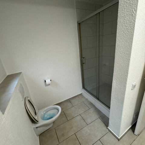 Das moderne Badezimmer ist funktional, sauber und gepflegt – mit Dusche, Waschbecken und WC ausgestattet, ideal auch für mehrere Personen gleichzeitig nutzbar.