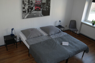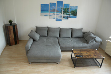 Gepflegte moderne Wohnung mit 2 Schlafzimmern a 25 qm mit je 3 Betten, 1 Wohnzimmer mit TV, 1 Wohnküche komplett ausgestattet, Bad mit Dusche.