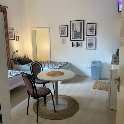 • Kleines Apartment: Ein gemütliches Doppelzimmer mit kleiner Küchenzeile, Badezimmer mit Dusche sowie eine Sitzgelegenheit im Hof, ideal für eine entspannte Pause.