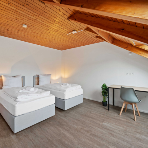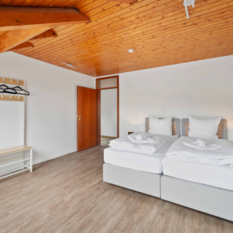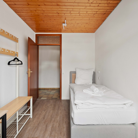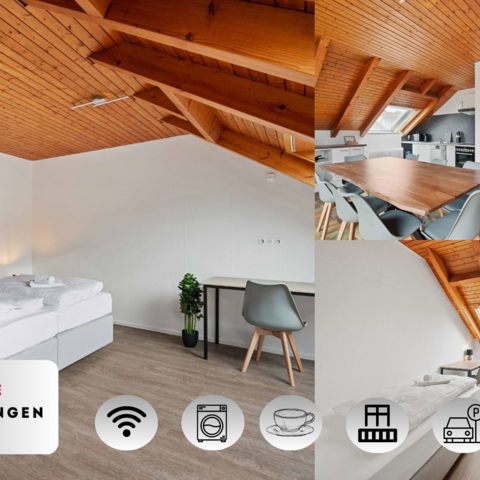 Die Wohnung bietet alles, was größere Gruppen wie Monteure benötigen: 4 Einzelzimmer mit Boxspringbetten, 2 Doppelzimmer mit getrennten Betten, eine gut ausgestattete Küche, einen Balkon, WLAN, 2 Duschen, 2 Waschbecken, 2 Toiletten und 2 Parkplätze. Bettwäsche inkl.