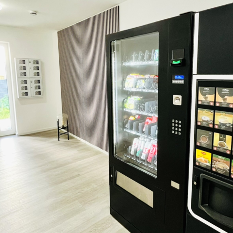 - 2 Snackautomaten mit Getränken, Kaffee und Lebensmitteln vorhanden