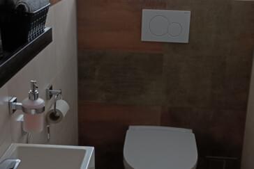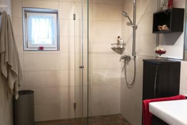 Die große Wohnküche mit Herd und Backofen, Spülmaschine, Kaffeemaschine, Toaster und Wasserkocher steht unseren Gästen gemeinsam zur Verfügung. Ebenso das neu renovierte Bad mit barrierefreier Regendusche, Waschbecken, Waschmaschine und Haartrockner.