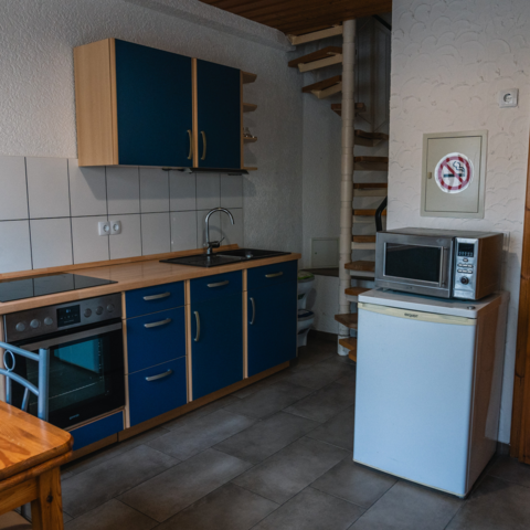 Küche mit Herd, Kühlschrank, Mikrowelle & Kaffeemaschine inkl. Geschirr & Töpfe.