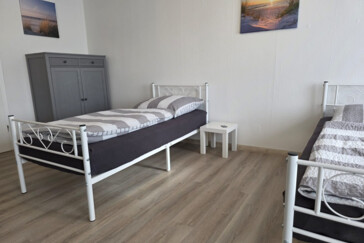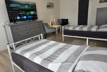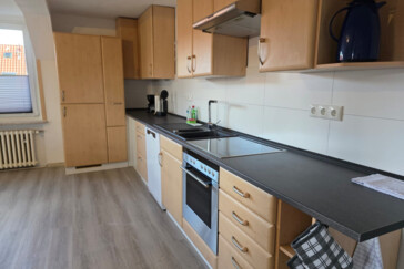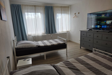 Wir bieten helle, neu eingerichtete Monteurzimmer mit 6 Übernachtungsmöglichkeiten. Wir verfügen über Einzelzimmer und Doppelzimmer mit getrennten Betten. Die Doppelzimmer können auch als Einzelzimmer gebucht werden. Zusätzlich kann ein Mehrbettzimmer gebucht werden. Die Doppelzimmer sind über 20 qm groß und alle Schlafzimmer verfügen über Außenjalousien, zum Ausschlafen am Wochenende bestens geeignet. Zur Wohnung gehört eine sehr große und sehr gut ausgestattete Küche, mit Kühlschrank, Gefrierschrank, Ceranfeld, Backofen, Geschirrspüler, Mikrowelle, Wasserkocher, Kaffeemaschine, Toaster etc. und einem großzügigen Esstisch. Ein Grill kann genutzt werden.