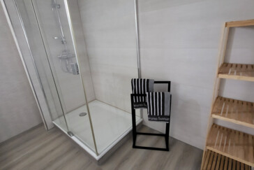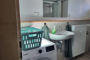 Das Badezimmer verfügt über eine geräumige Glasdusche, Waschbecken, Waschmaschine, WC und Föhn. Ausreichend Handtücher, sowie Bettwäsche werden gestellt.