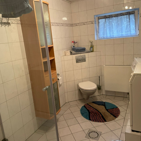 Bad besteht aus WC, Waschbecken sowie Dusche.