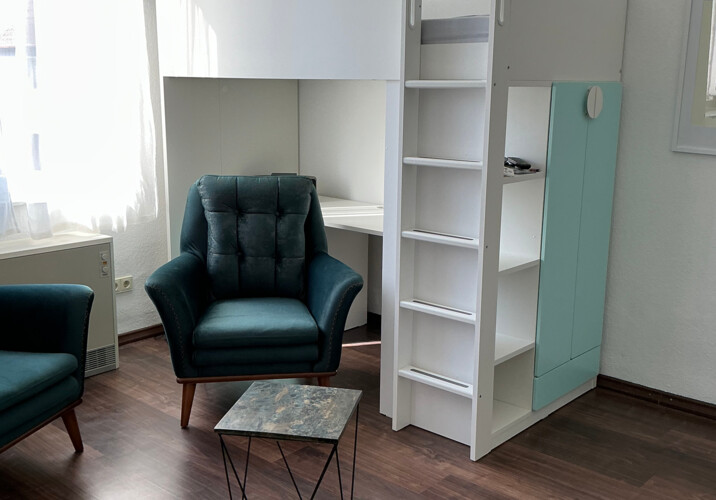 Im Wohnzimmer stehen zwei Fernsehsessel mit Tisch und Fernseher .Des Weiteren besteht hier die Möglichkeit in einem Hochbett zu schlafen ?.