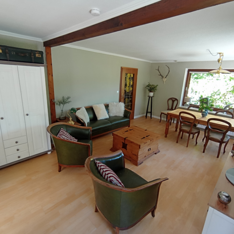 Ein großes Wohnzimmer mit einem 50” Smart-TV eine Leder Couch sowie Sessel und großzügigen Holzesstisch laden zum Verweilen und Entspannen ein.