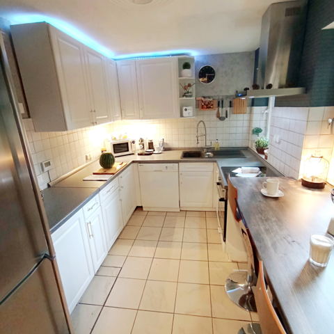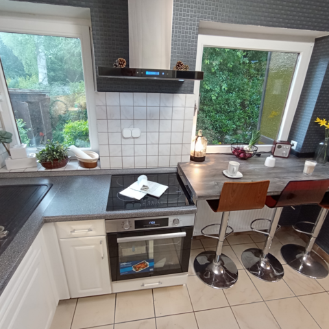 Eine komplett eingerichtete Küche mit allen Utensilien ( XL Kühlschrank mit Froster/ Geschirrspülmaschine / Töpfe / Pfannen/ Geschirr / Besteck / Gläser / Toaster/ Waschmaschine / Herd / Wasserkocher / Kaffeemaschinen usw.) bieten ideale Voraussetzungen für die