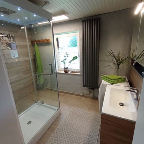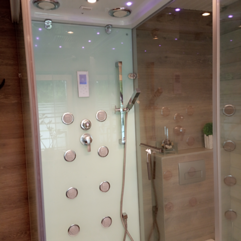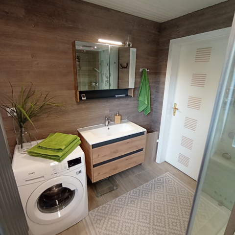 Eine weiteres Highlight ist ein großes Bad mit einer Wellnessdampfdusche samt Waschmaschine und das auch mit einem Trockner überrascht.