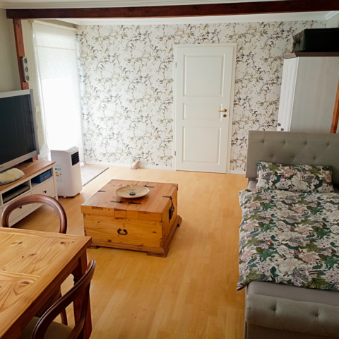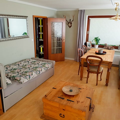 (Eine Aufbettung mit einem Extra Bett im Wohnzimmer ist auf Wunsch möglich.)