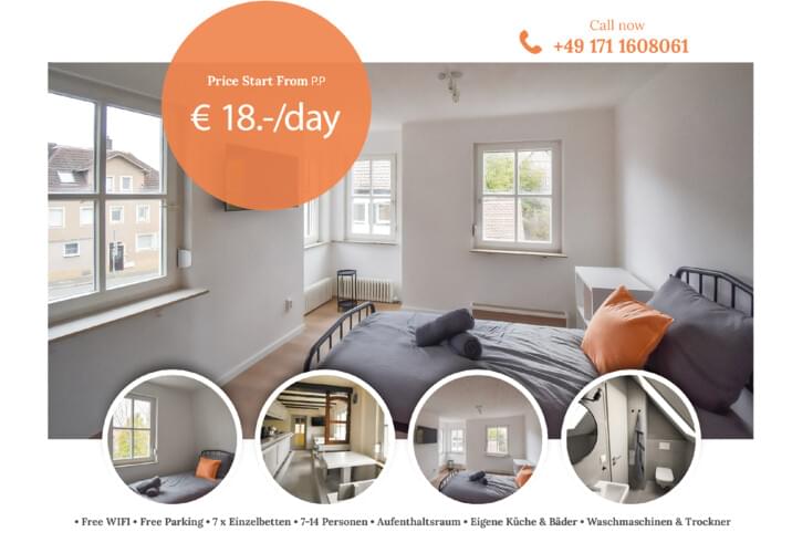 Vermietet wird ein schönes vollmöbliertes kernsaniertes Haus mit 7x Schlafzimmern und einem einzigartigem Aufenthaltsraum im Herzen von Heilbronn/Neckarsulm. Das Haus besteht aus insgesamt 6 abgetrennten Schlafzimmer, die entweder über ein/oder zwei Einzelbetten verfügen. Dementsprechend bietet das Objekt Platz für bis zu 14 Personen. Ein großer Aufenthaltsraum mit TV, großzügiger vollausgestatteter Küche, sowie 5 Duschen und 6 WCs. Ein schöner Garten zum Entspannen und Grillen befindet sich hinter dem Haus. Der private Parkplatz bietet Platz für bis zu drei Fahrzeuge.
