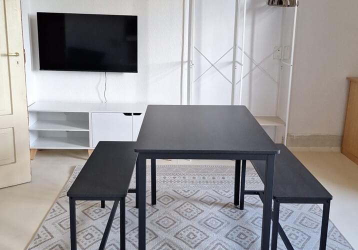 Die Wohnung verfügt über eine komplett eingerichtete Küche mit Herd, Backofen, Kühlschrank, Gefrierfach, Mikrowelle, Kaffeemaschine, Wasserkocher und allen wichtigen Kochutensilien. Das modern geflieste Bad ist mit Dusche, Waschbecken, WC und Waschmaschine ausgestattet – perfekt für längere Aufenthalte. Kostenloses Highspeed-WLAN und ein großer Smart-TV sorgen für Unterhaltung und gute Arbeitsmöglichkeiten.