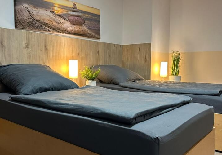 Unsere Monteurzimmer sind natürlich möbliert und verfügen über getrennte Betten, Schrank und Kühlschrank (je eins pro Zimmer), je Zimmer ein separates Bad mit Dusche/WC und einer voll ausgestatteten Pantryküche.