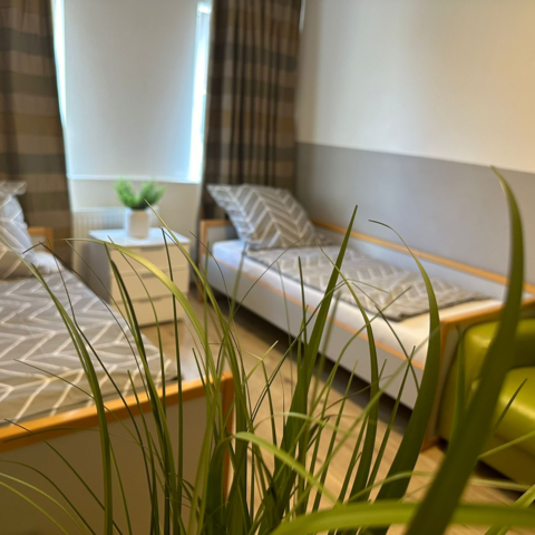 Unsere Monteurzimmer sind natürlich möbliert und verfügen über getrennte Betten, Schrank und Kühlschrank (je eins pro Zimmer), je Zimmer ein separates Bad mit Dusche/WC und eine voll eingerichtete Pantryküche .