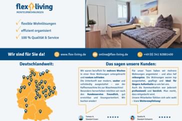 Stellen Sie Ihre Anfrage bequem auf unserer Website www.flex-living.de und erhalten Sie Ihr unverbindliches Angebot.