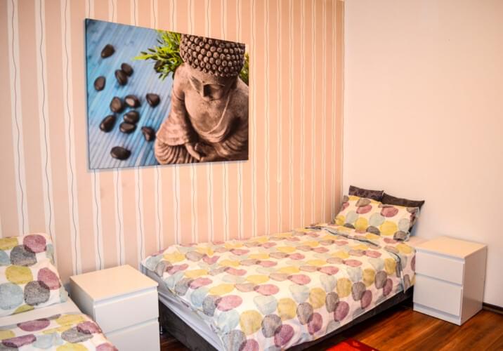 Die Wohnung verfügt über 2 Zimmer, 1 Badezimmer, eine löffelfertige Küche und einen Balkon. Es gibt 2 Einzelbetten, 2 Schränke, eine TV-Kommode im Schlafzimmer. Im Wohnzimmer steht eine Vitrine mit Sat-Flachfernseher, ein Esstisch mit 3 Stühlen und ein Sofa mit Schlaffunktion. WLAN und Waschmaschine ist inbegriffen.