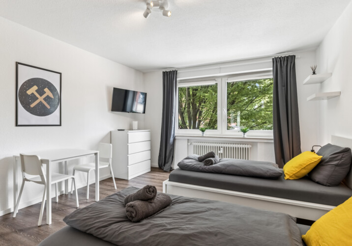 Moderne Wohnungen in Bochum, Herne, Essen, Herten, Marl, Dorsten für 2–50 Personen. Komfortable Betten und Matratzen, Küche mit Spülmaschine & Waschmaschine, WLAN (Highspeed), Smart-TV in jedem Schlafzimmer, Badezimmer mit Badewanne, Bettwäsche inkl. Handtücher, privater Parkplatz.