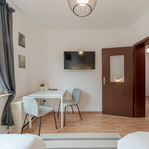 Das Mehrbettzimmer bietet eine praktische und angenehme Unterkunft, ideal für Handwerker und Reisende. Die behagliche Einrichtung schafft eine entspannende Atmosphäre, die nach einem langen Arbeitstag zur Erholung einlädt. Ausgestattet mit einem Smart-TV können Sie Ihre Abende auf unterhaltsame Weise gestalten.