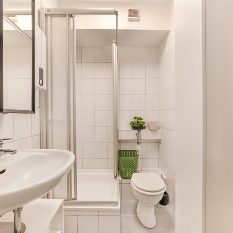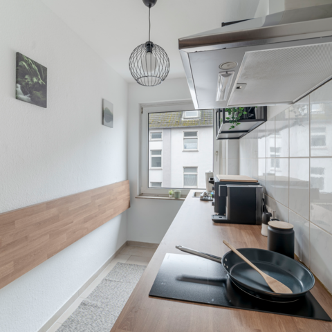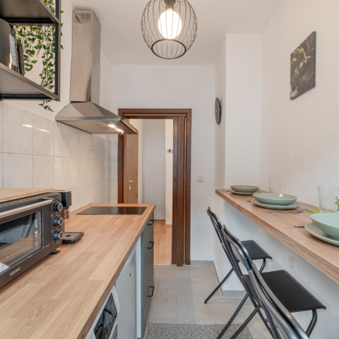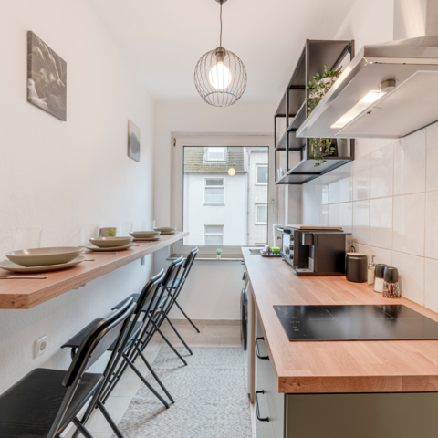Die moderne Küche bietet Ihnen die Möglichkeit, eigene Mahlzeiten zuzubereiten. Hier finden Sie alles, was Sie benötigen, einschließlich Herd, Kühlschrank, Kochutensilien und einer Kaffeemaschine für den perfekten Start in den Tag. Auch eine Waschmaschine ist vorhanden, damit Sie frische Wäsche genießen können.