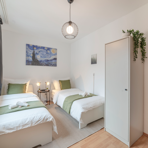 Die ruhige Lage des Apartments trägt zur Erholung bei. In der Umgebung gibt es verschiedene Geschäfte und Cafés, die zu einem kurzen Spaziergang einladen. Zudem sind gute Verkehrsanbindungen vorhanden, die es leicht machen, die Stadt zu erkunden oder zur Arbeit zu gelangen. Hier können Sie sich wohlfühlen, egal ob für einen kurz- oder langfristigen Aufenthalt.