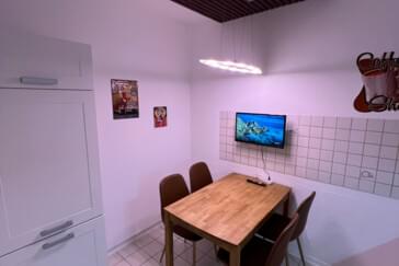 Die Küche ist komplett ausgestattet mit Kühlschrank und wichtigem Kochzubehör, sodass selbst längere Aufenthalte komfortabel sind. Das moderne Badezimmer verfügt über eine Dusche, Waschmaschine und bietet alle notwendigen Annehmlichkeiten.
