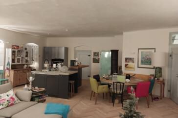 Wir bieten eine große abgeschlossene Wohnung für einen entspannten Aufenthalt. Die Wohnung verfügt über Fussbodenheizung. Ein großer ca. 100 m² großer Wohn- und Essbereich mit Küchenblock modern ausgestattet.