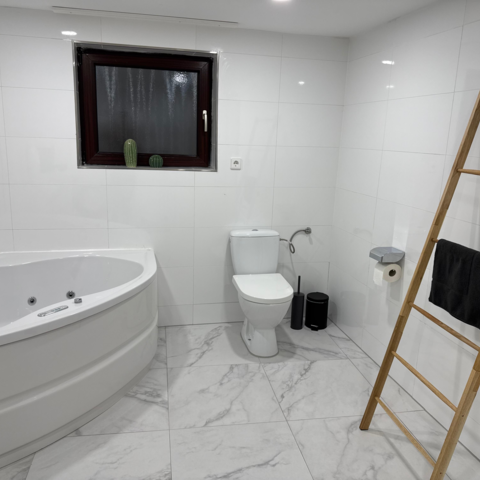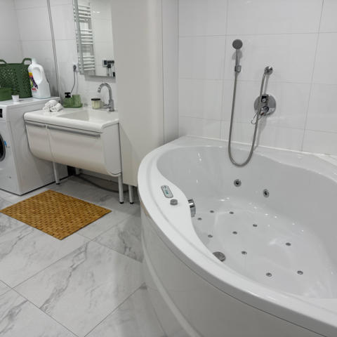 Im Erdgeschoss befinden sich die voll ausgestattete Küche sowie das Badezimmer mit Whirlpool-Badewanne – das besondere Highlight des Hauses.