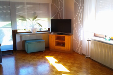 1 Wohnzimmer mit Schlafcouch, TV und Terrassenzugang